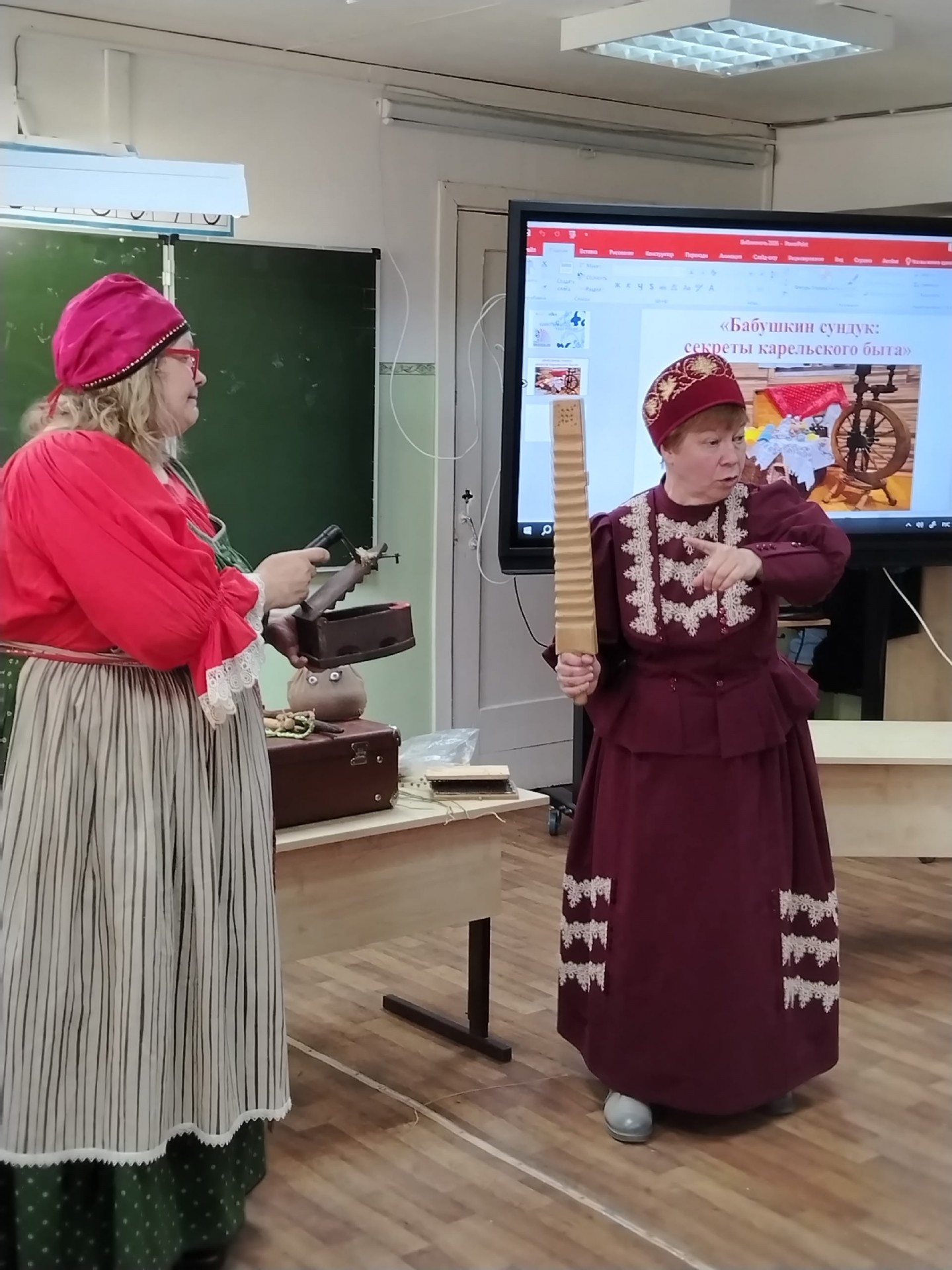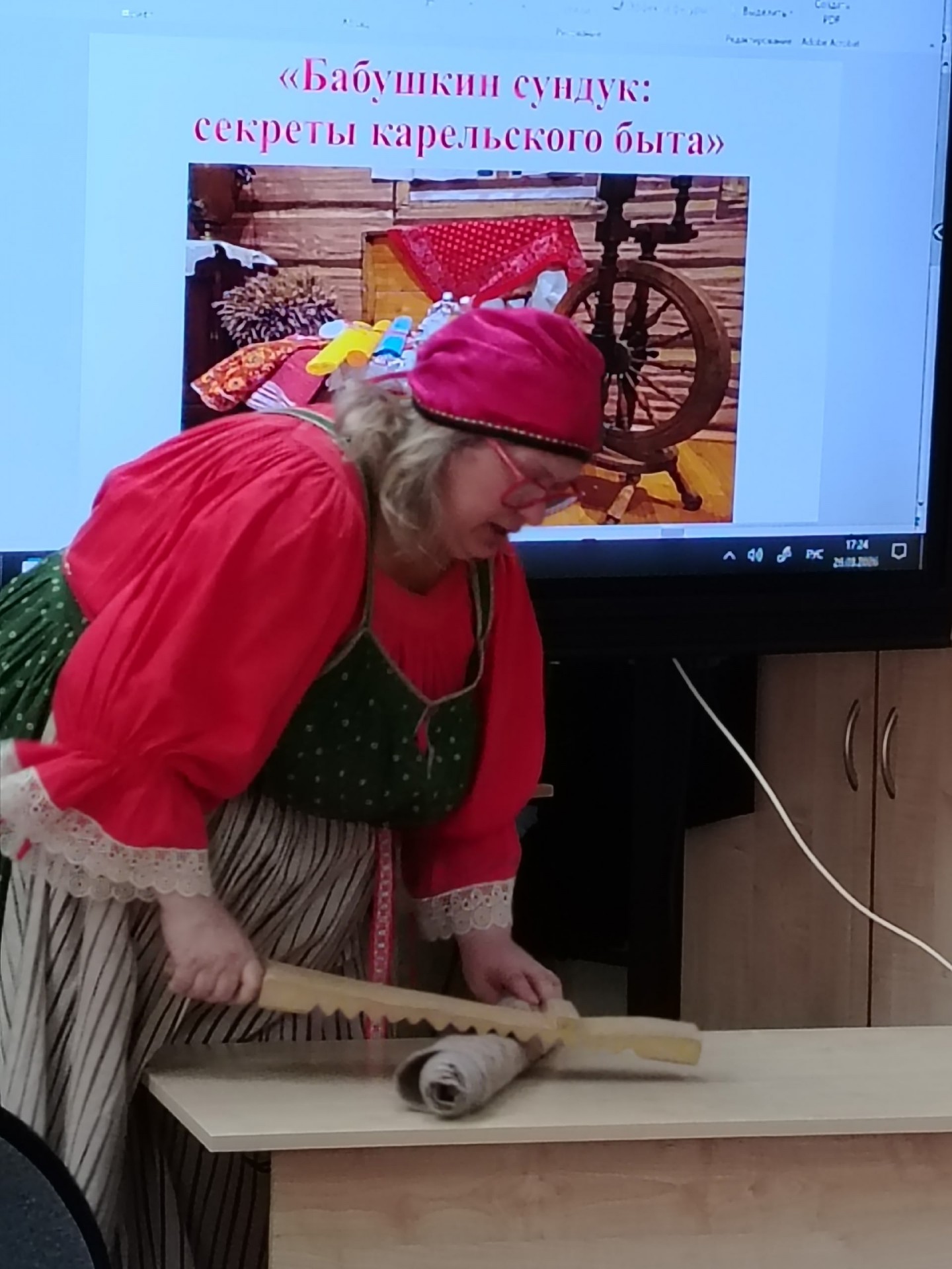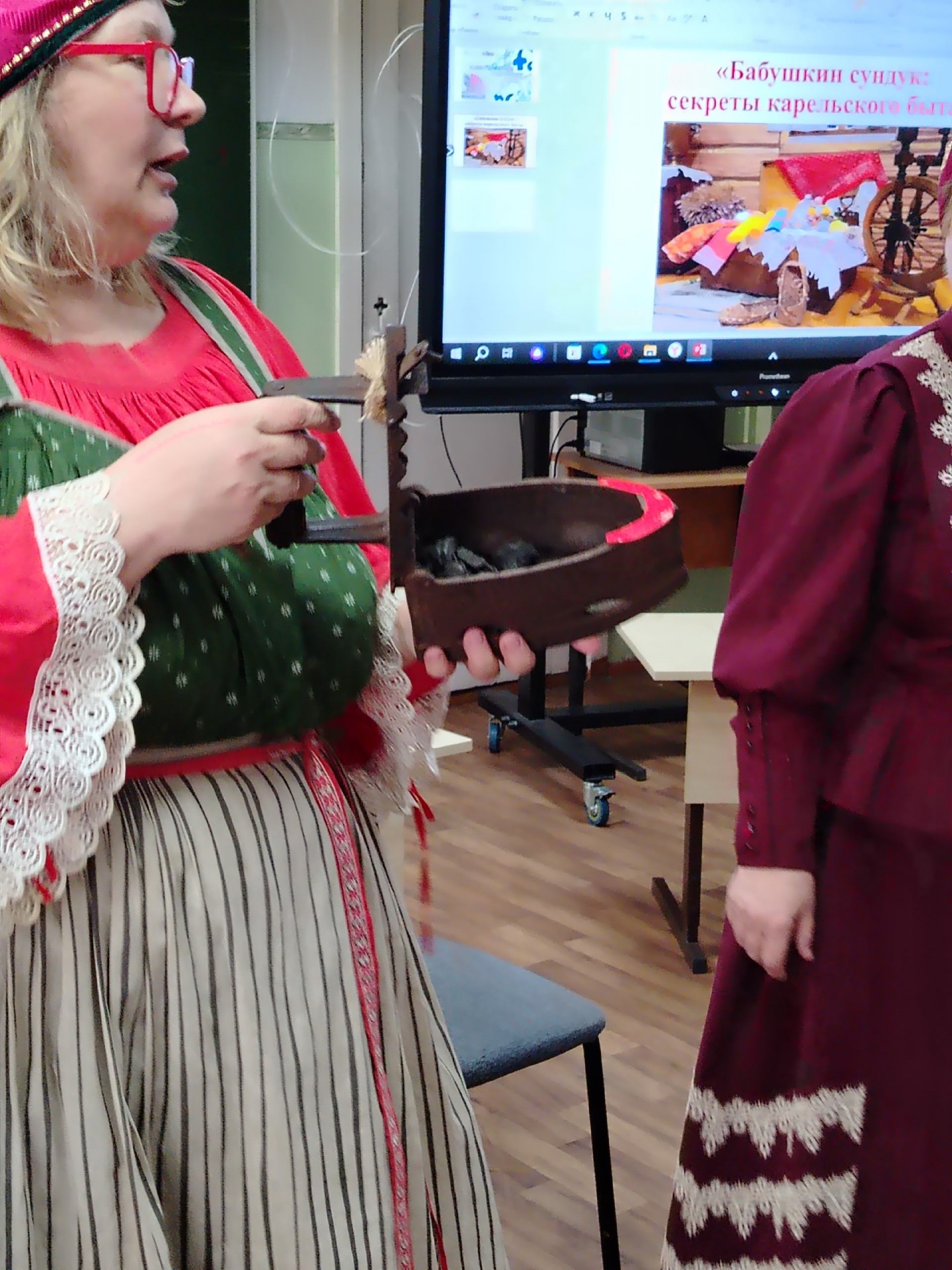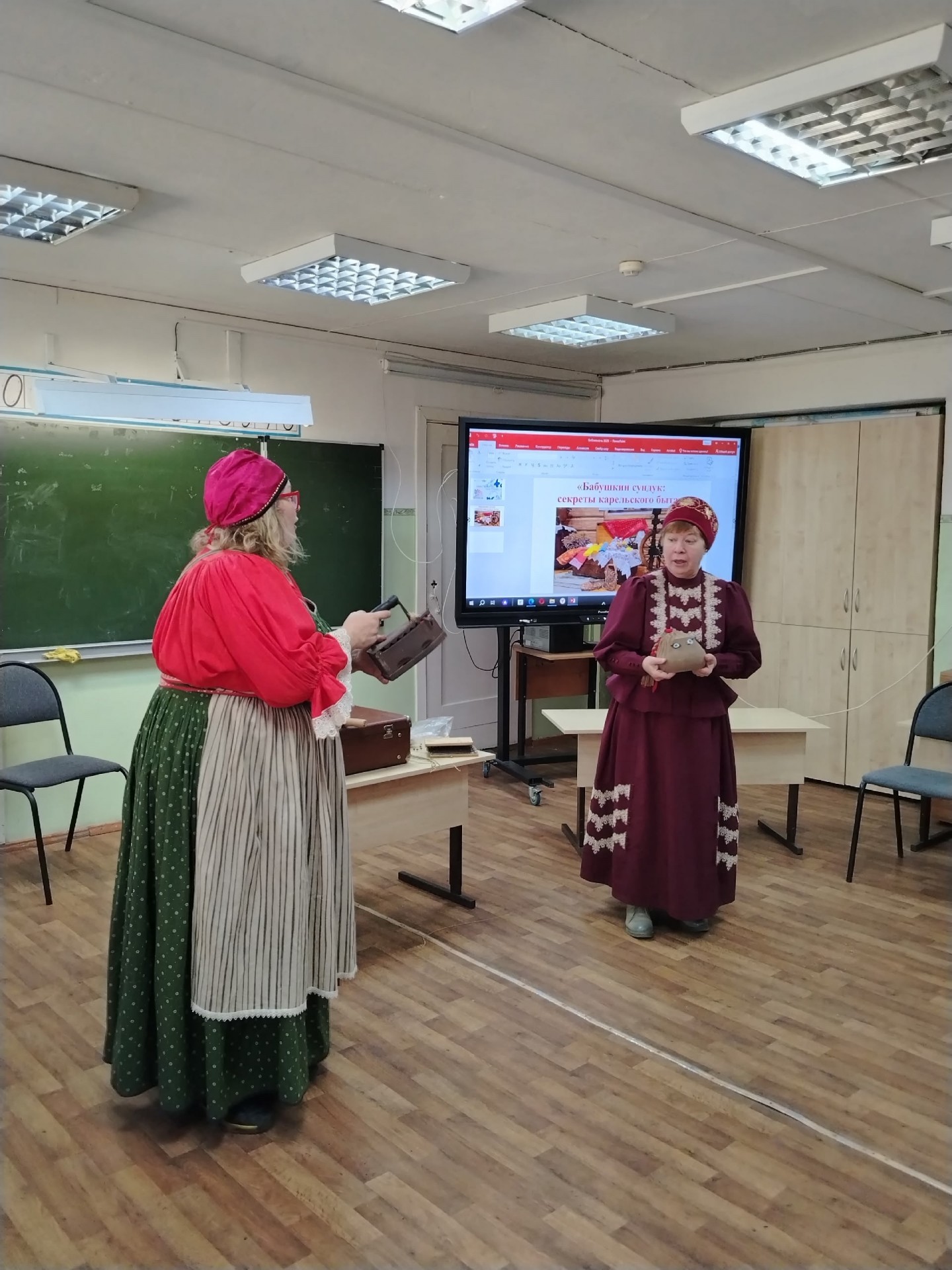 Наше мероприятие мы назвали «Бабушкин сундук: секреты карельского быта». Мы погрузились в атмосферу старинной карельской деревни. А проводниками стали сотрудники Этнокультурного центра Пряжинского района Сеппянен Татьяна Павловна и Гладилина Наталья Анатольевна.