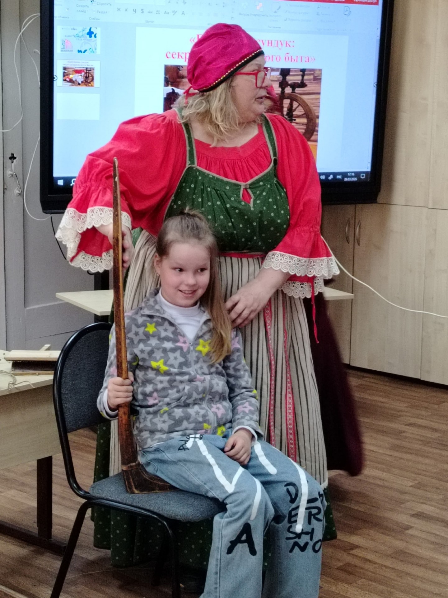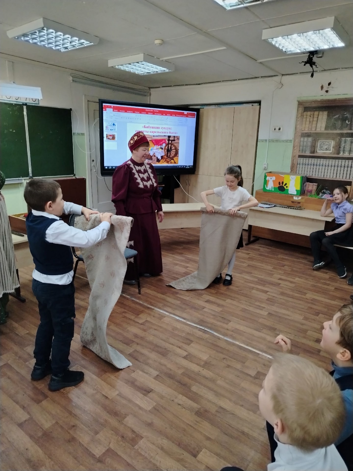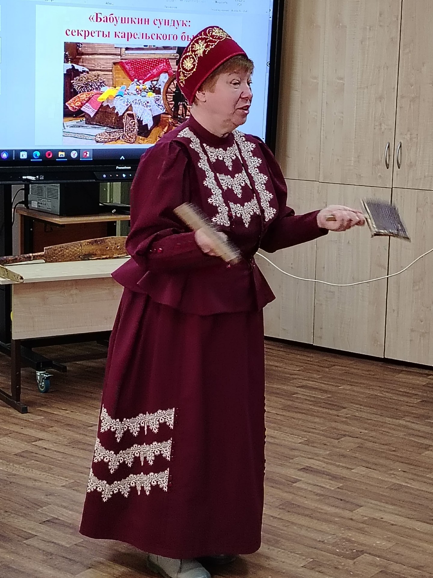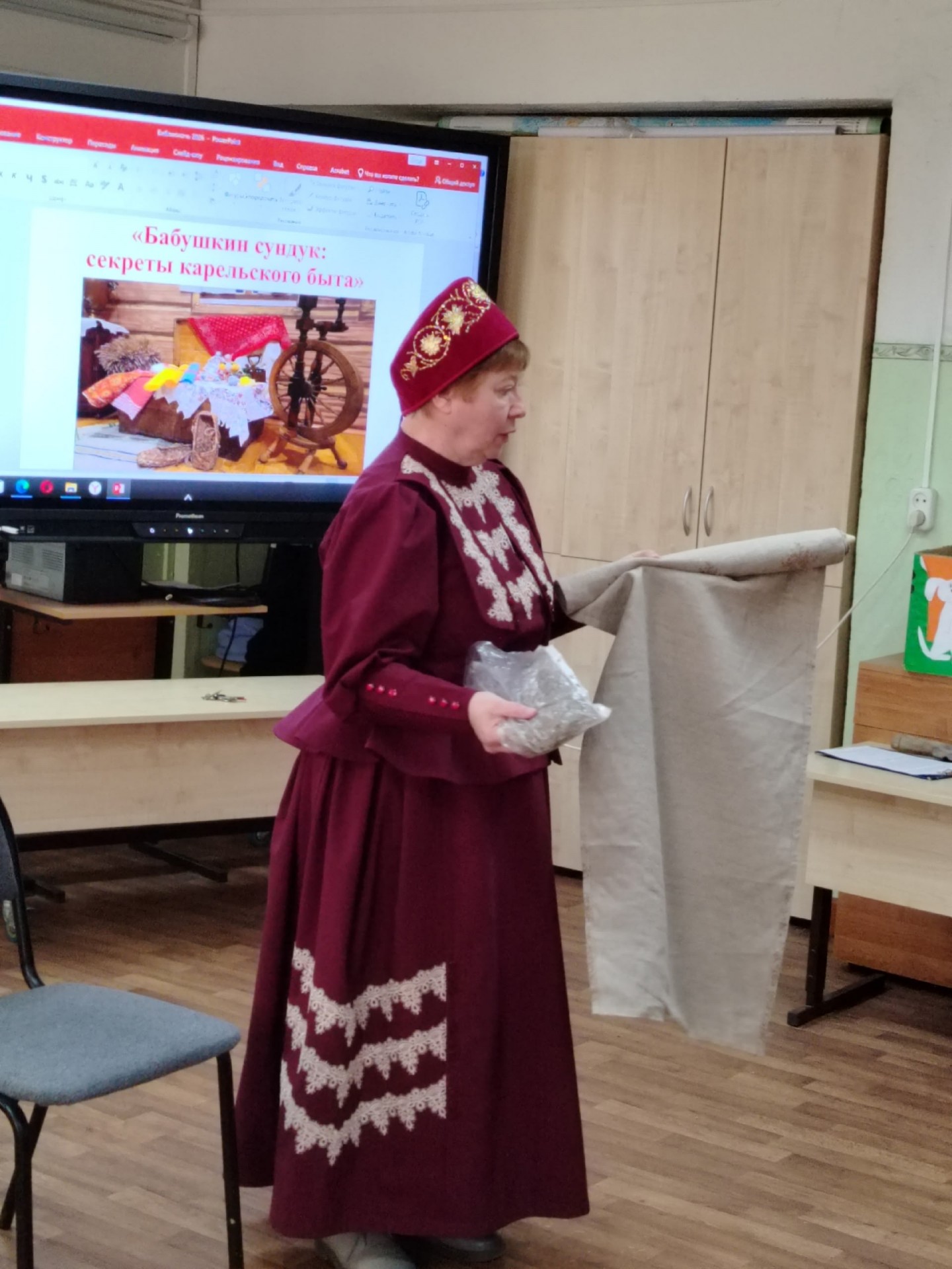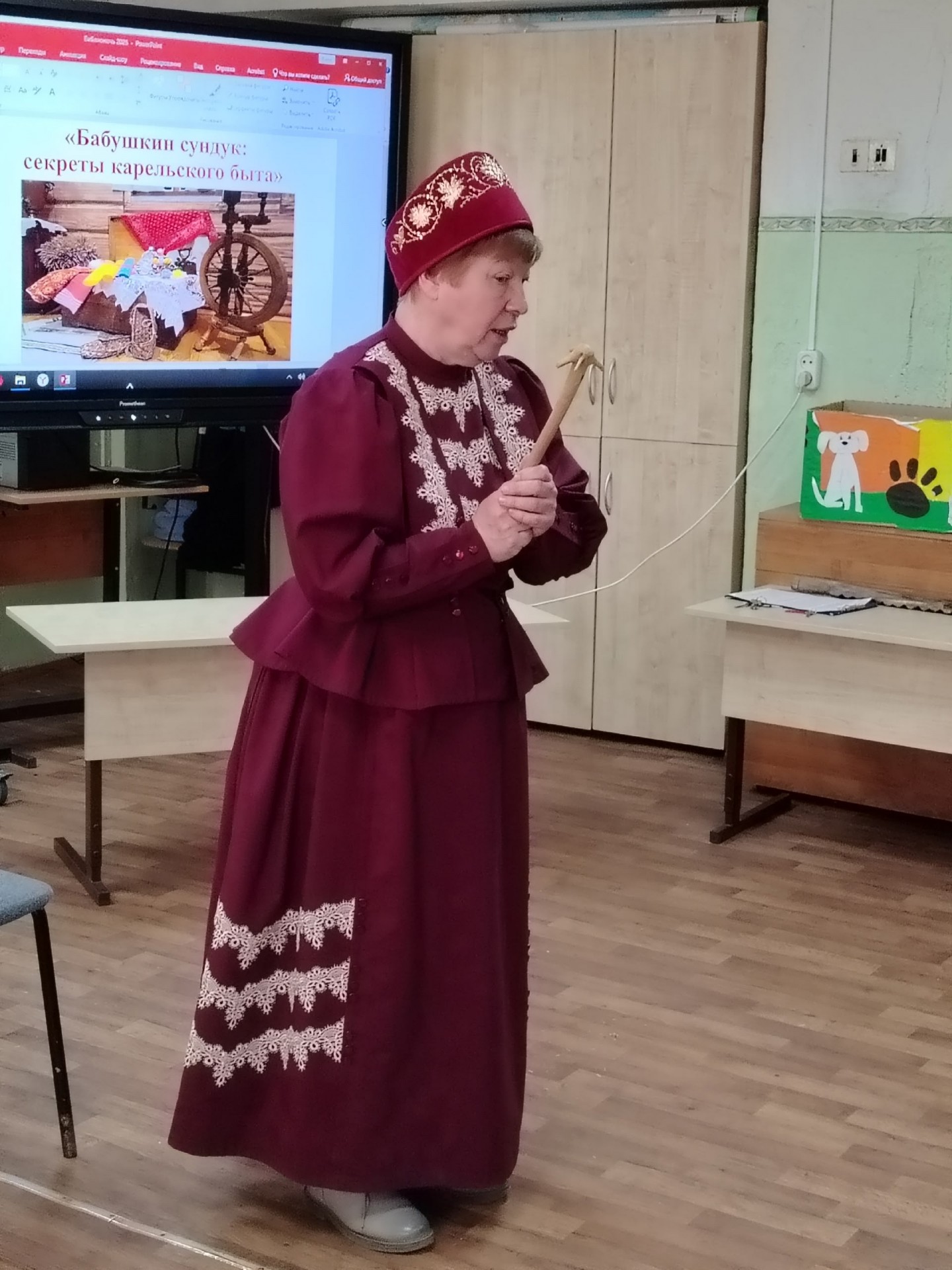 Наше мероприятие мы назвали «Бабушкин сундук: секреты карельского быта». Мы погрузились в атмосферу старинной карельской деревни. А проводниками стали сотрудники Этнокультурного центра Пряжинского района Сеппянен Татьяна Павловна и Гладилина Наталья Анатольевна.