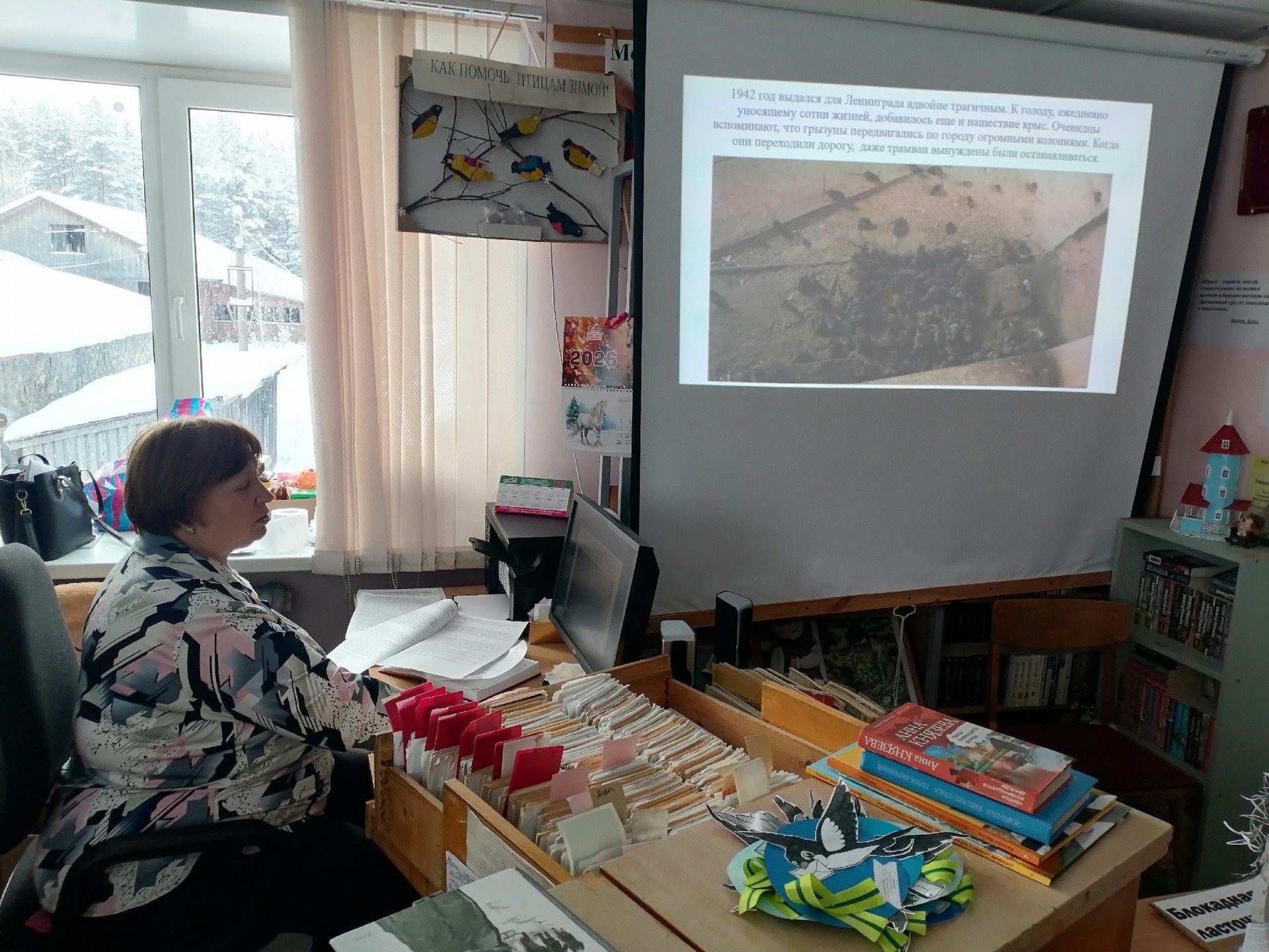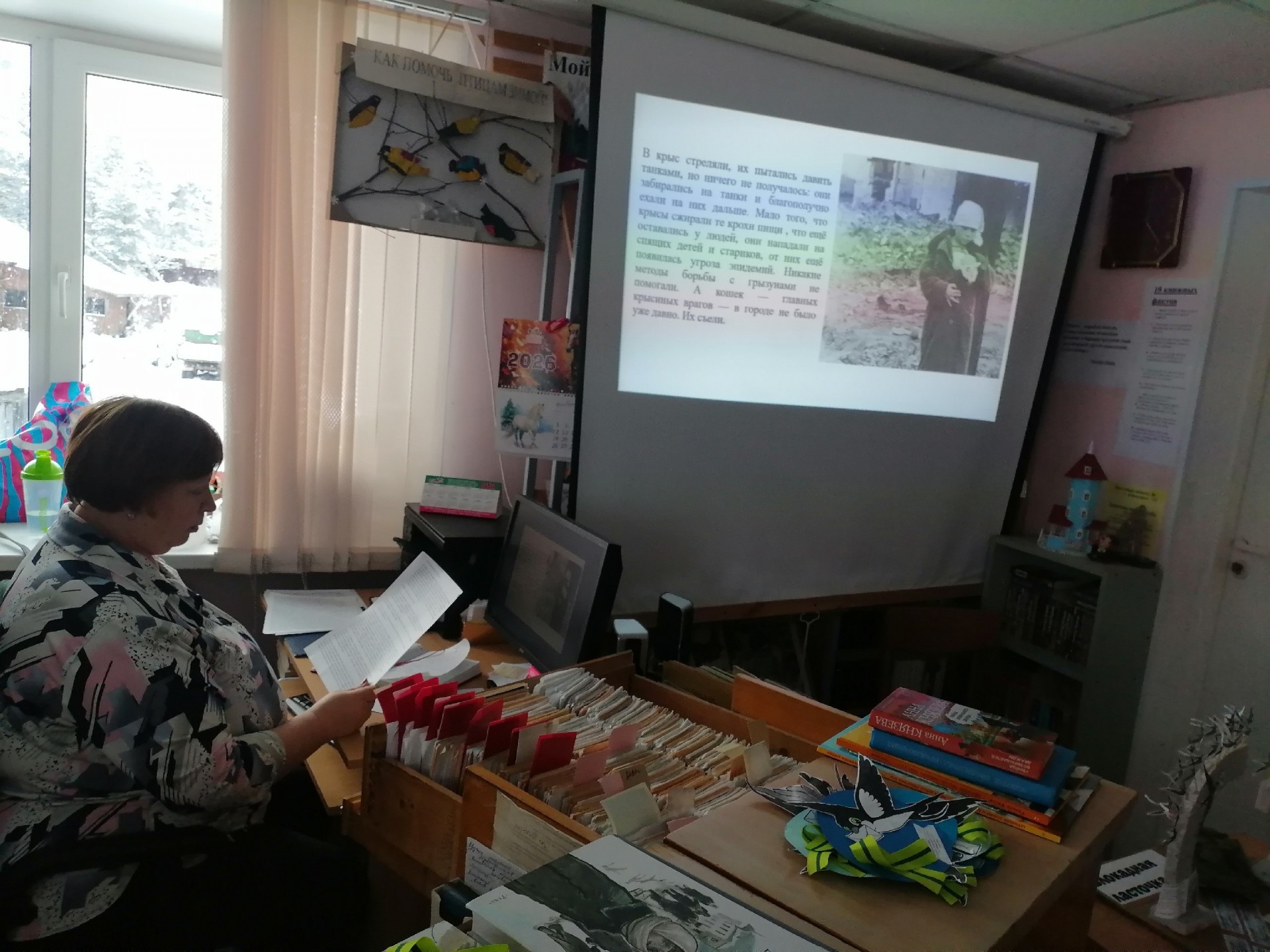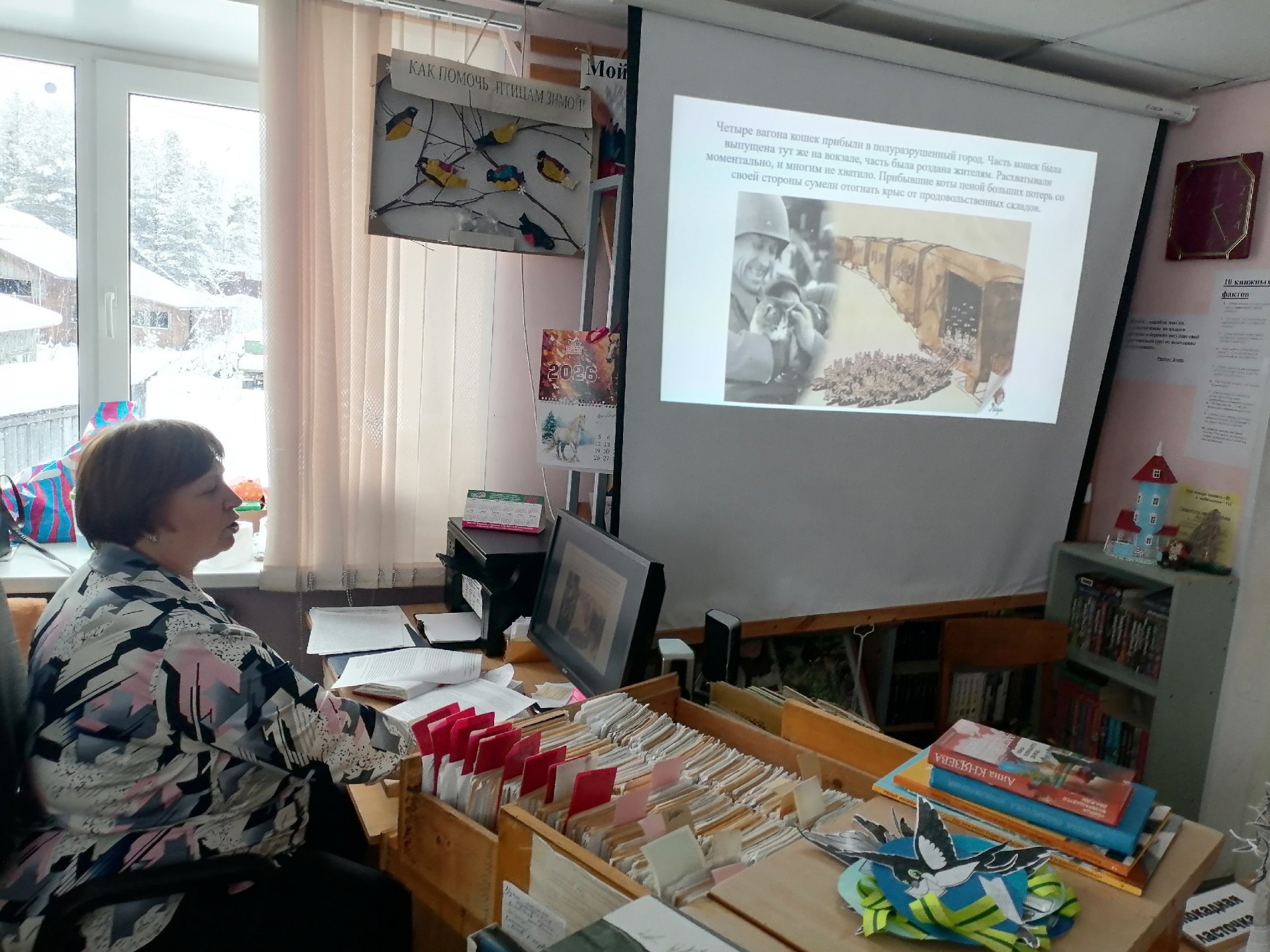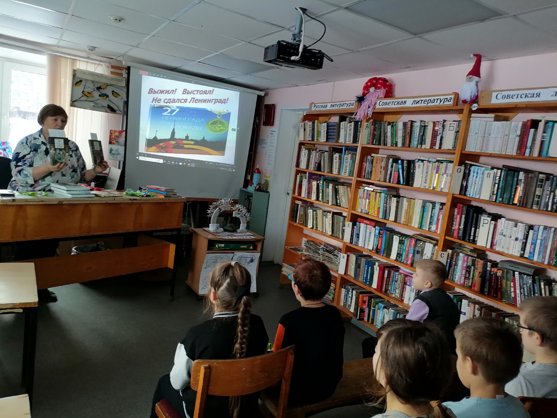 Библиотекарь рассказала ребятам о тяжелых испытаниях, выпавших на долю жителей блокадного Ленинграда: о голоде и холоде, о детях и женщинах, работавших наравне с мужчинами на заводах, о защите и обороне Ленинграда советскими солдатами. Ребята узнали о блокадных кошках. «Мяукающая дивизия» — так в шутку называли прибывших животных блокадники — была брошена в «бой». Сначала кошки, измученные переездом, осматривались и всего боялись, но быстро оправились от стресса и принялись за дело. Улицу за улицей, чердак за чердаком, подвал за подвалом, не считаясь с потерями, доблестно отвоевывали они город у крыс. Говорят, что в год прорыва блокады и отступления фашистов была разгромлена и «крысиная армия». Некоторые считают, что история о «блокадных кошках» — это легенда. Однако документы и воспоминания блокадников говорят об обратном.