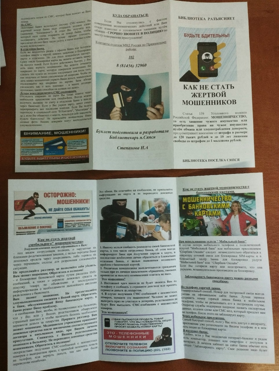 В библиотеке п.Сяпся в рамках профилактической работы была проведена беседа «Алло, мне звонит мошенник». Участникам рассказали, как действовать, если вам звонит незнакомец и просит передать личные данные, представляясь, например, сотрудником банка или работником силовых структур.