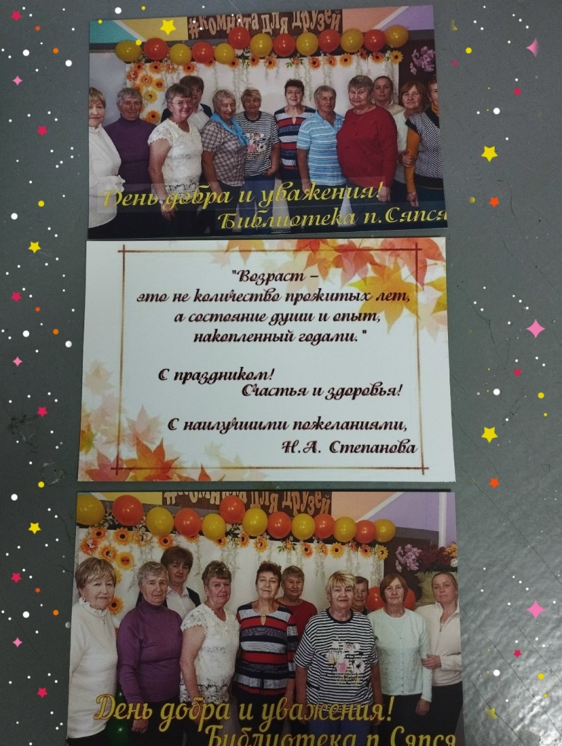 В библиотеке посёлка Сяпся в честь праздника прошёл ретро-квест «Вперёд к весёлому прошлому!». Мероприятие началось с тёплых слов поздравления от Юлии Петровны Ояла, депутата Эссойльского сельского поселения. Затем все плавно перенеслись назад в прошлое. Посетили магазин "Находка", сходили в музей и кинотеатр. Музыкальные конкурсы: допой песню, отгадай песню по нескольким нотам, отгадай название фильма по фразе, добавили вечеру особый колорит. Время проведенное в теплой компании за чашечкой чая прошло незаметно и весело. В конце праздника все гости получили фото весёлой компании и приз, выигранный в лотерею.